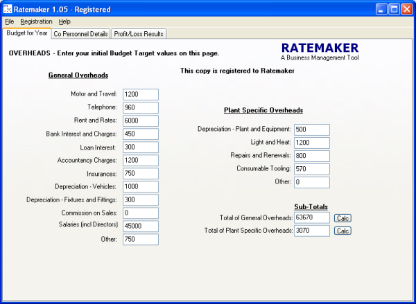 The reason this list of fields has been separated from the General Overheads, is to make it possible for you to use this tool to calculate separate hourly rates that are to be applied to different items of plant or departments. Otherwise, for a global hourly rate that applies to all plant or departments, all that is necessary is to treat this section similarly to the General overheads and enter the yearly forecasts.